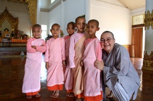 Hello. That’s me with some of the cute young nuns in Myanmar. (Of course they ordain for as long as they like and can leave at any time.) My name is Mujin. In the Korean ordination system (i am an ordained Korean bhikkuni -- nun) we are called Sunim; it is the title so actually, i am called Mujin Sunim. Then in formal occasions, because people end up calling me Mrs. Mujin Sunim (!), we usually put Venerable in front, as a title. So i end up as Venerable Mujin Sunim; most people call me “mujin.”